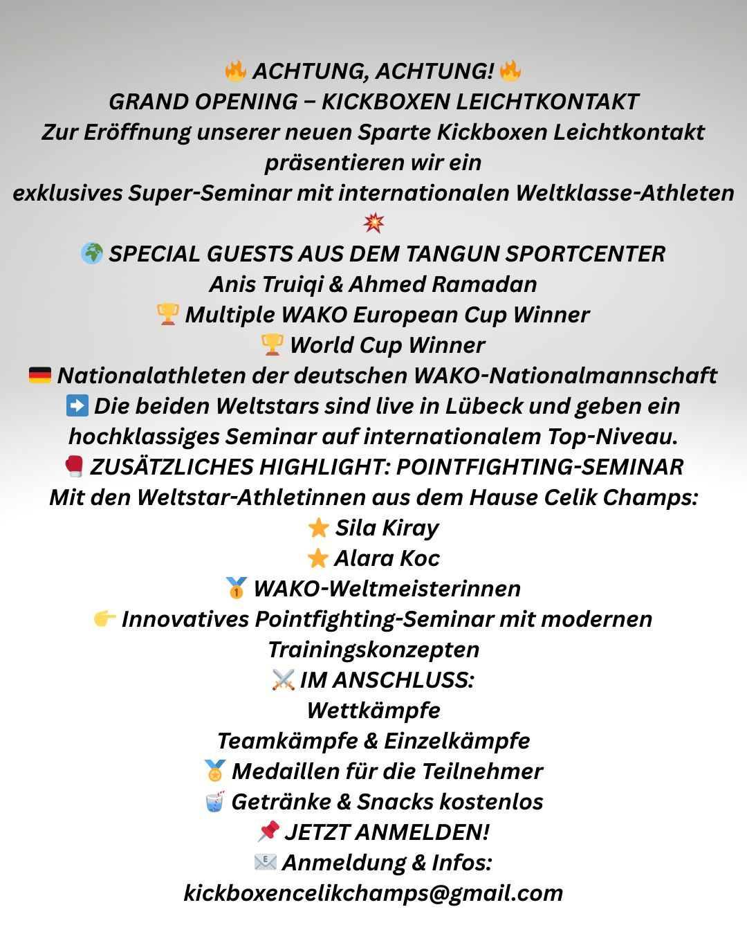 Freu Dich auf ein **exklusives Super-Seminar** mit internationalen Weltklasse-Athleten, WAKO-Nationalkämpfern und **Weltmeisterinnen im Pointfighting**.