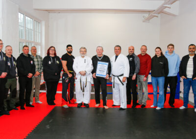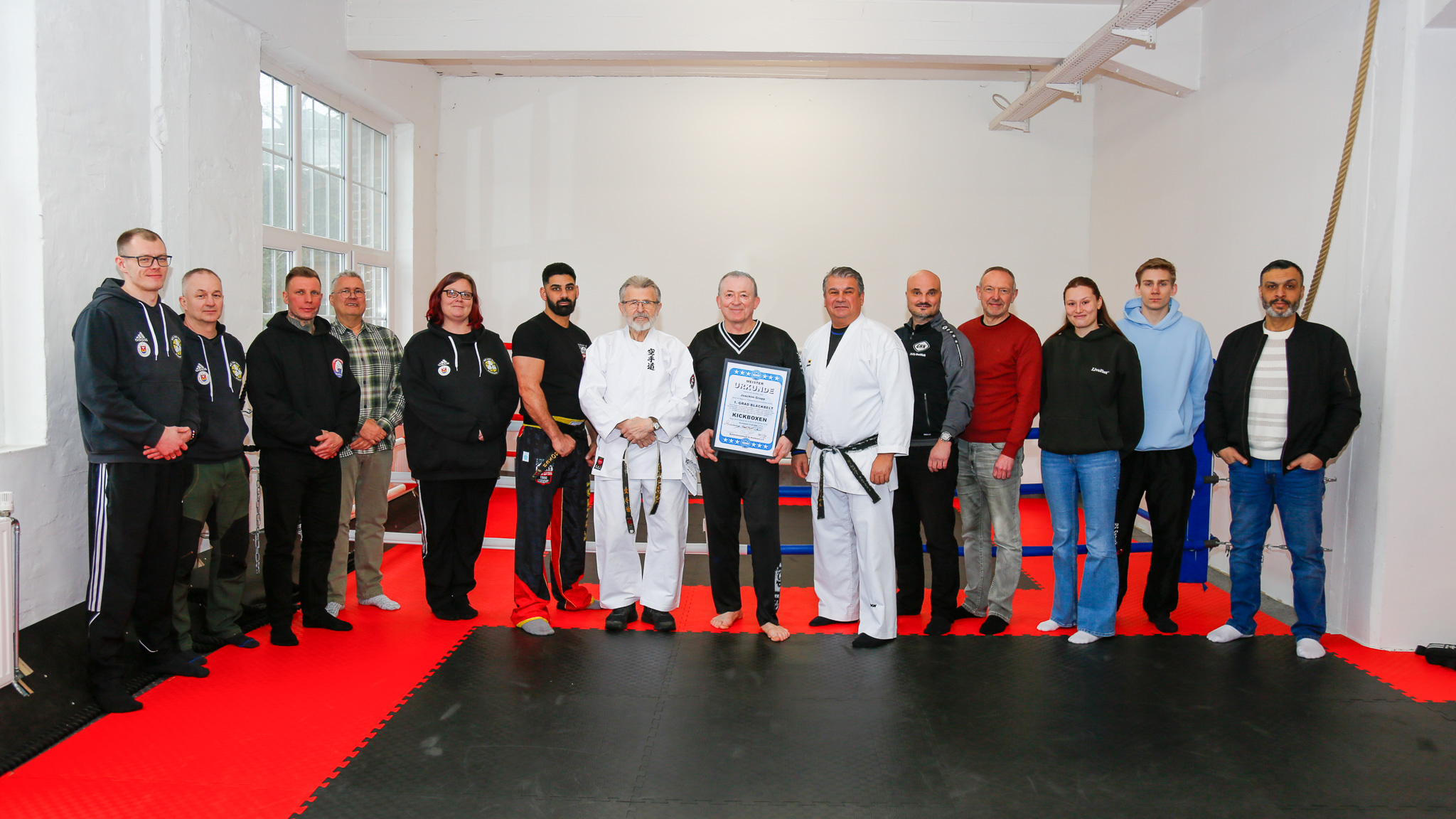 Einen besonderen Abschluss fand der Verbandstag nach dem offiziellen Teil der Veranstaltung: Joachim Grupp, bundesweit bekannter Fachbuchautor insbesondere im Karate-Bereich, legte erfolgreich seine Prüfung zum 1. Dan im Kickboxen ab. Die Prüfung wurde von Gerd Lemmens und Himmet Kaysal abgenommen. Dieser besondere Moment rundete den Verbandstag ab und ist auch auf dem Abschlussfoto des Tages festgehalten.